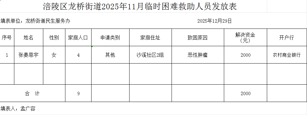 涪陵区龙桥街道2025年11月份临时困难救助人员发放表