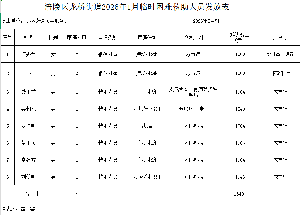 涪陵区龙桥街道2026年1月份临时困难救助人员发放表