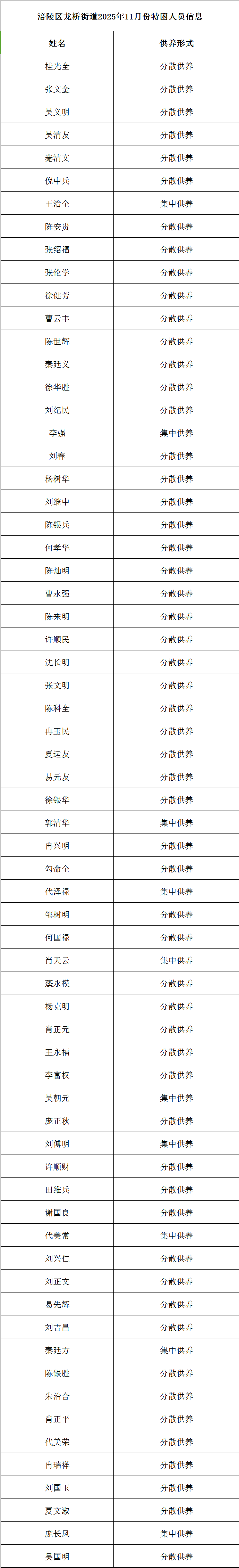 涪陵区龙桥街道2025年11月份特困人员公示
