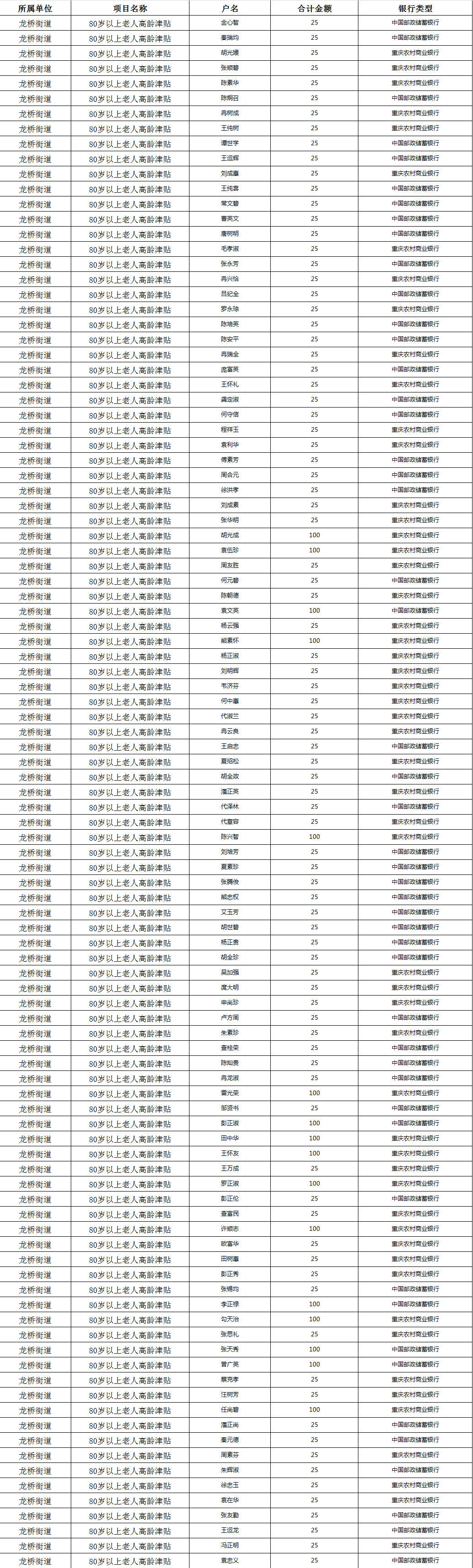涪陵区龙桥街道2025年11月份高龄补贴发放情况