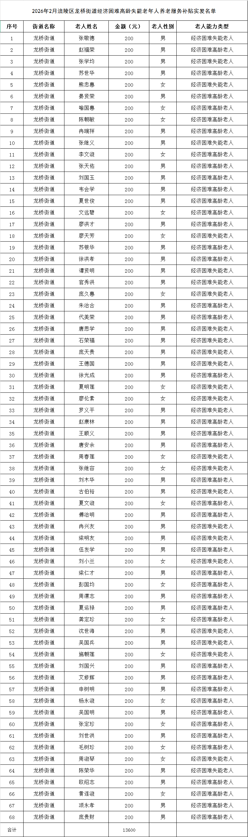 涪陵区龙桥街道2026年2月份经济困难高龄失能老年人养老服务补贴实发名单