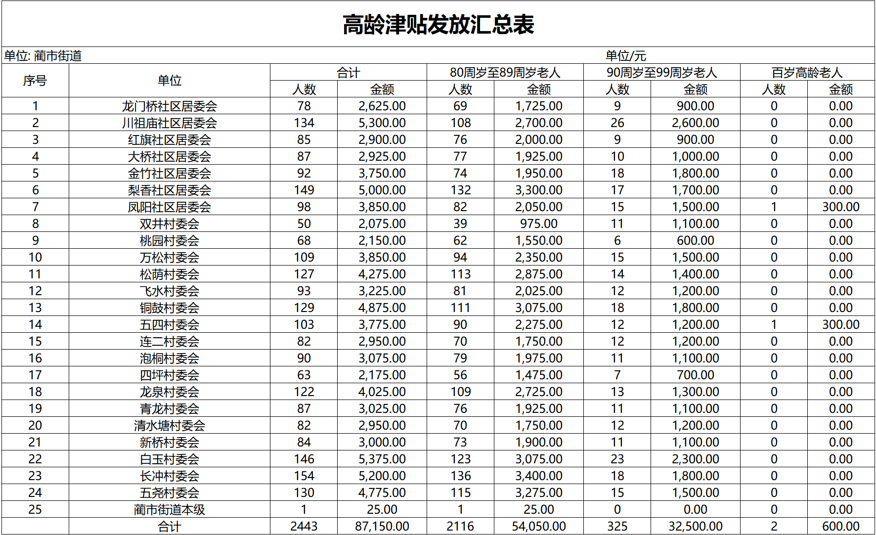 蔺市街道2026年1月高龄津贴发放汇总表