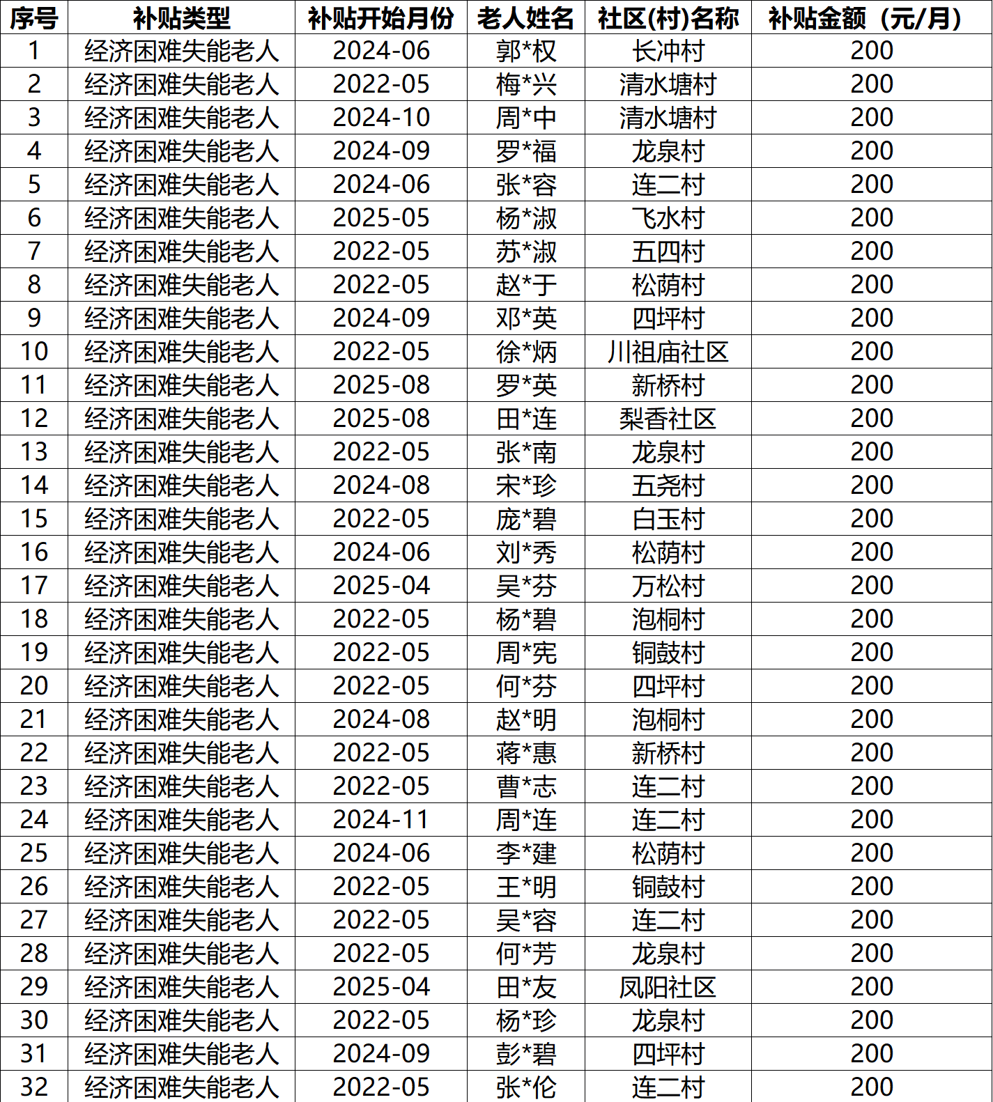 2025年11月涪陵区蔺市街道经济困难失能老人养老服务补贴名单