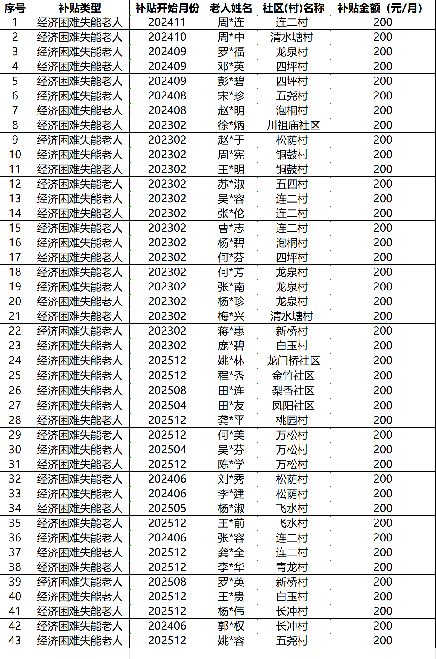 2025年12月涪陵区蔺市街道经济困难失能老人养老服务补贴名单
