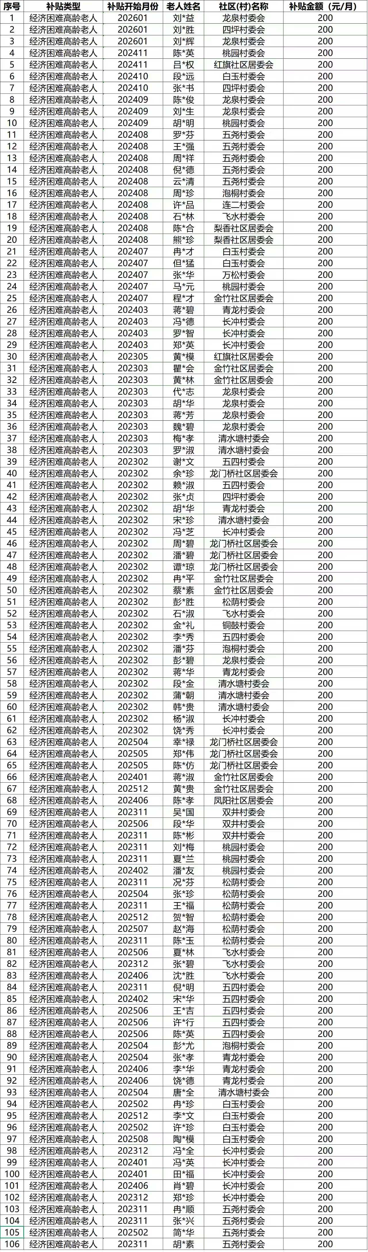 2026年1月涪陵区蔺市街道经济困难高龄老人养老服务补贴名单