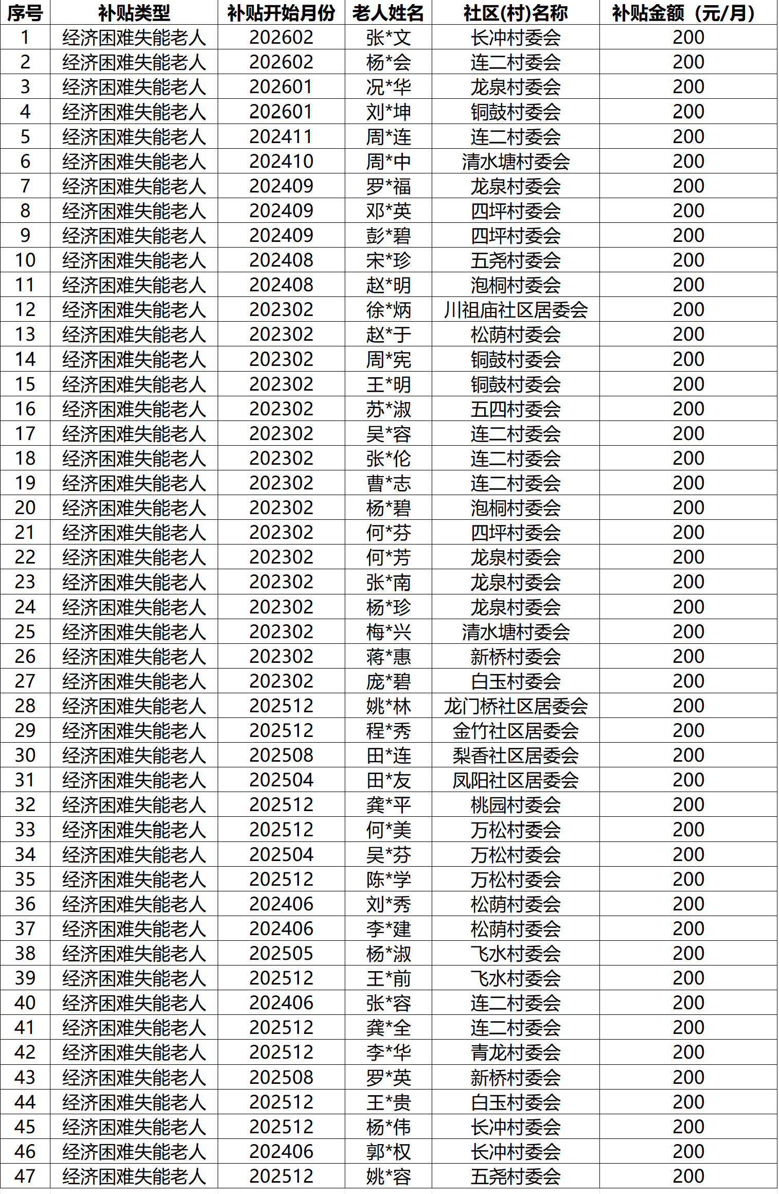 2026年1月涪陵区蔺市街道经济困难失能老人养老服务补贴名单