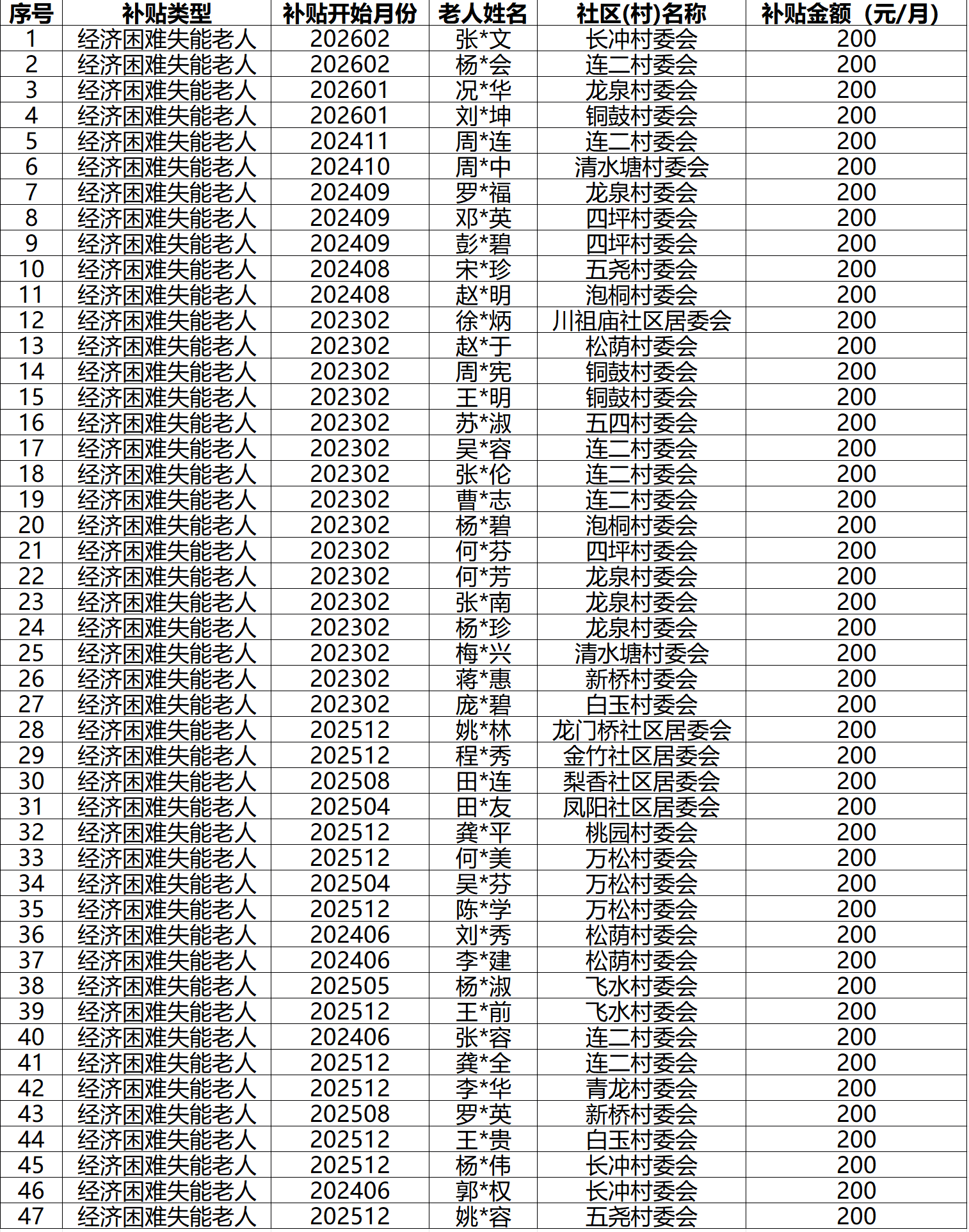 2026年2月涪陵区蔺市街道经济困难失能老人养老服务补贴名单