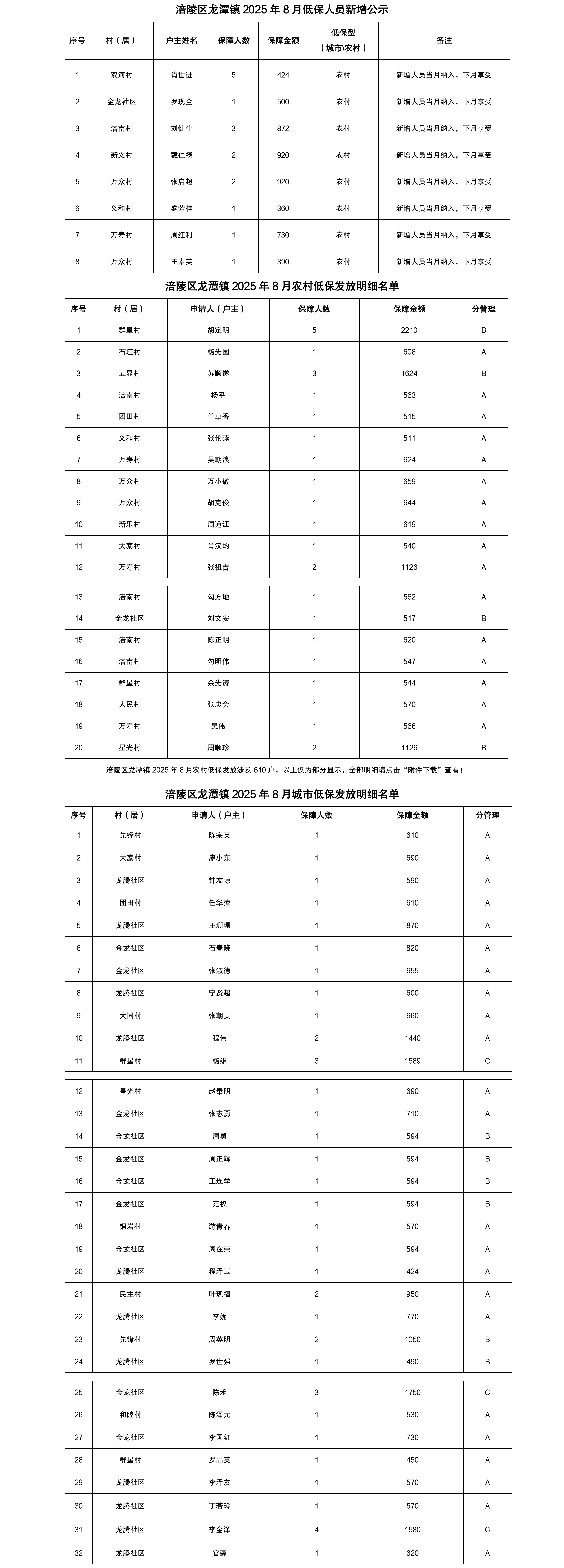 涪陵区龙潭镇2025年8月城乡低保新增人员及个人发放明细表