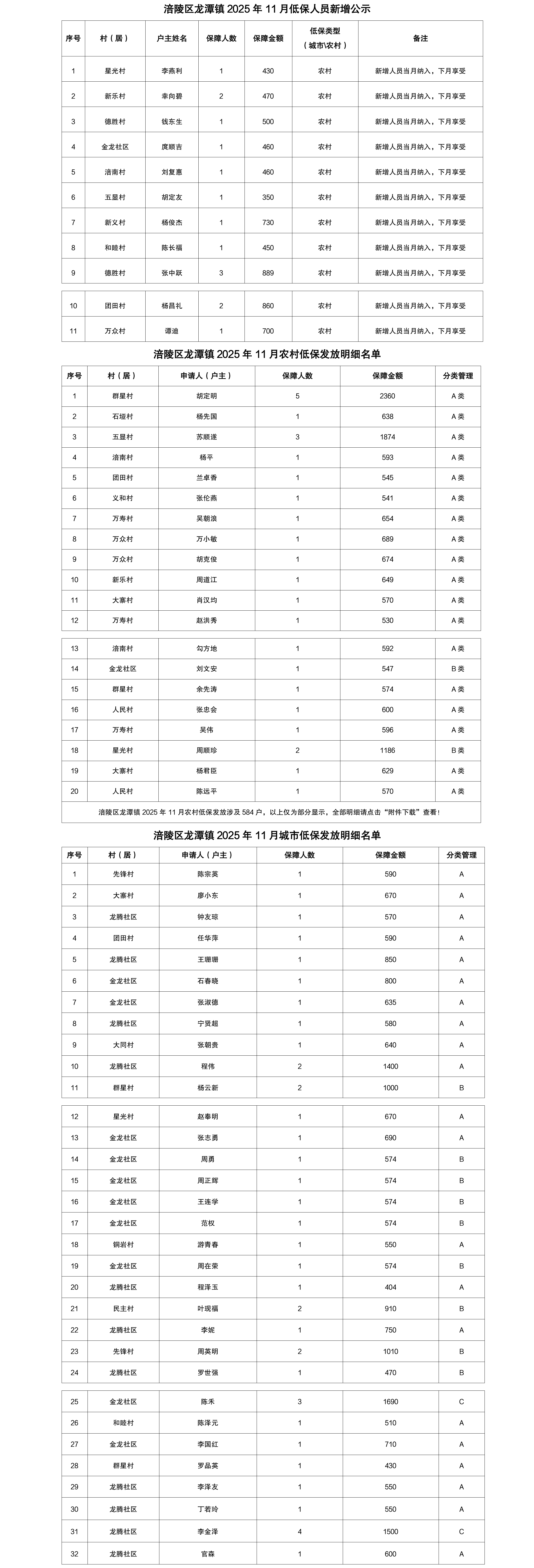 涪陵区龙潭镇2025年11月城乡低保新增人员及个人发放明细表