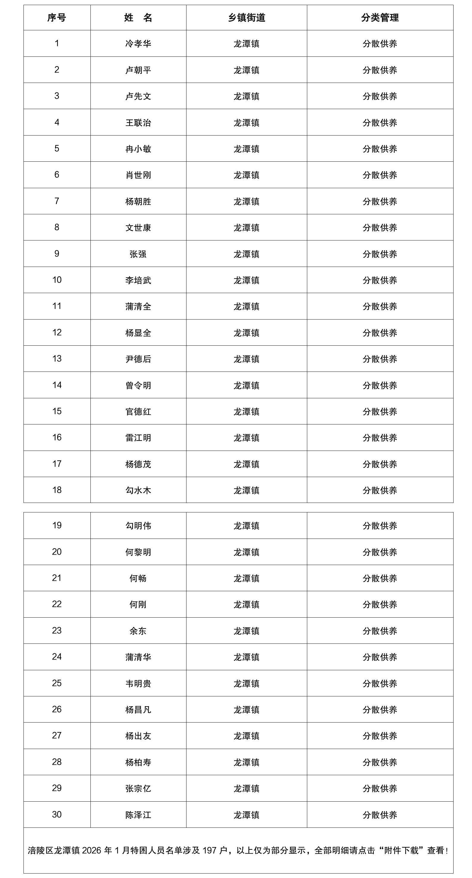 涪陵区龙潭镇2026年1月特困人员名单