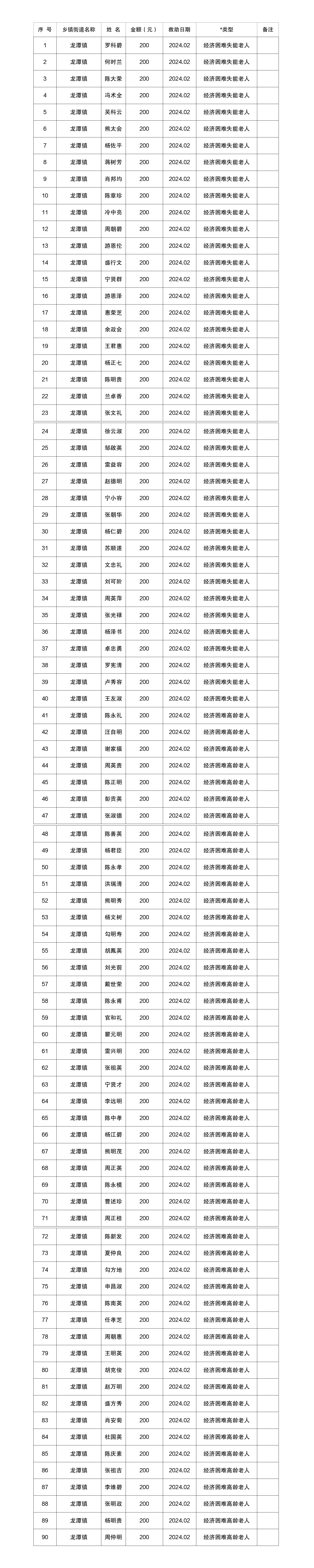 2024年2月涪陵区龙潭镇经济困难高龄失能老年人养老服务补贴实发名单