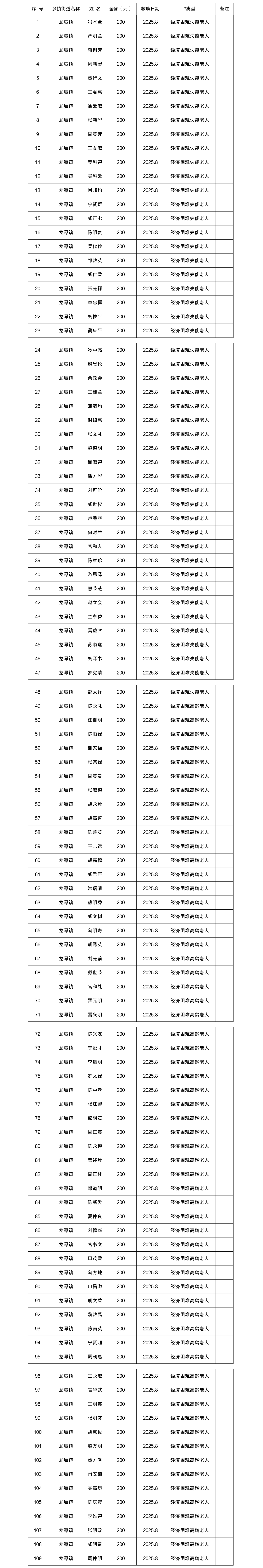 2025年8月涪陵区龙潭镇经济困难高龄失能老年人养老服务补贴实发名单