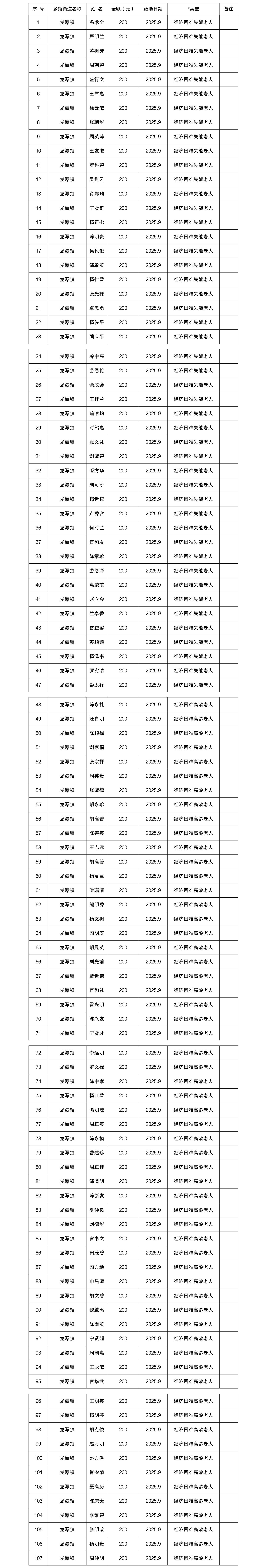 2025年9月涪陵区龙潭镇经济困难高龄失能老年人养老服务补贴实发名单
