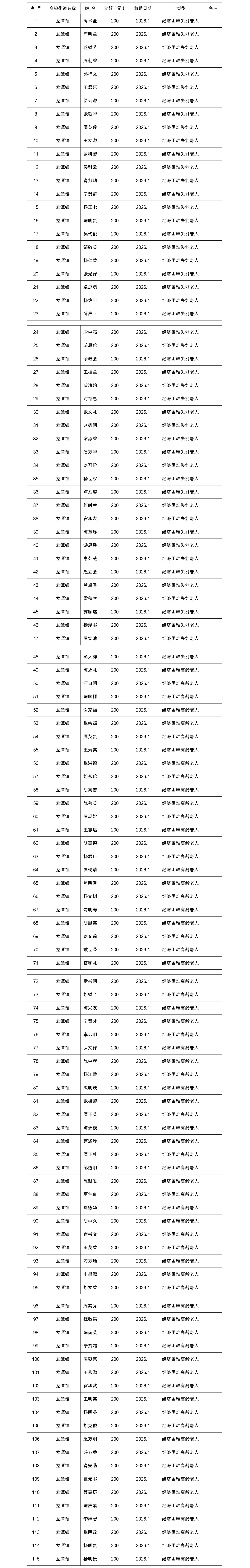 2026年1月涪陵区龙潭镇经济困难高龄失能老年人养老服务补贴实发名单
