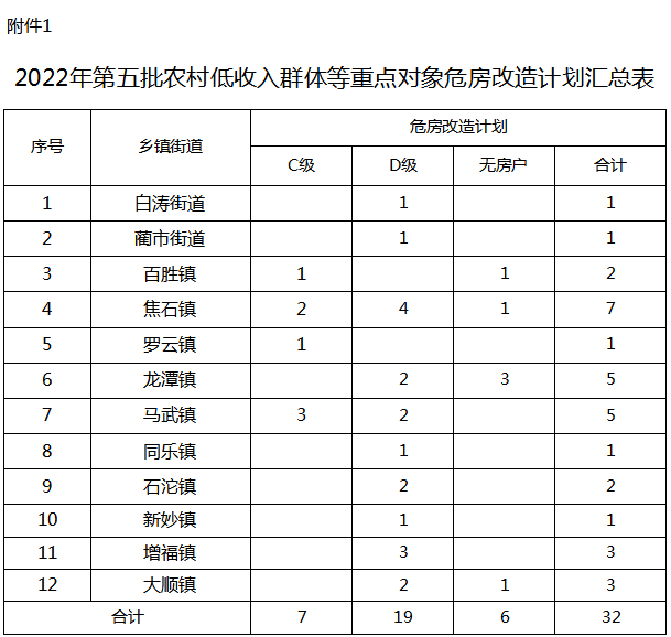 一、经区乡村振兴局、区民政局对各乡镇(街道)申报计划 农户的低收入群体身份再次核实,中介机构对其房屋安全等级逐户核查及各乡镇(街道)公示确认后,共有 32 户(C 级 7 户,D 级 19 户,无房户 6 户)符合农村低收入群体等重点对象危房改造条件,作为此次计划下达。补助标准按C 级每户 0.75 万元,D 级和无房户每户 3.5 万元执行,务必于 2022 年 11 月 30 日前全部竣工。
