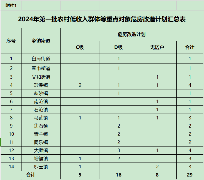 一、经区乡村振兴局、区民政局对各乡镇(街道)申报计划农户的低收入群体身份再次核实,中介机构对其房屋安全等级逐户核查及各乡镇(街道)公示确认后,共有 29 户(C 级 5 户、D级 16 户、无房户 8 户)符合农村低收入群体等重点对象危房改造条件,作为此次计划下达。补助标准按 C 级每户 0.75 万元,D级和无房户每户 3.5 万元执行,若出新政策,补助标准按照新的政策执行。各乡镇街道要采取有力措施加快推进,确保 2023 年12 月初前全部开工,2024 年 2 月底前全部竣工。