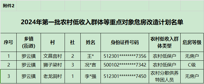 为动态保障农村低收入群体等重点对象住房安全,实现巩固拓展脱贫攻坚成果同乡村振兴有效衔接。我委对各乡镇(街道)动态监测的农村低收入群体等重点对象危房进行收集,现将符合危房改造条件的作为 2024年第一批农村低收入群体等重点对象危房改造计划下达(详见附件),具体事项如下: