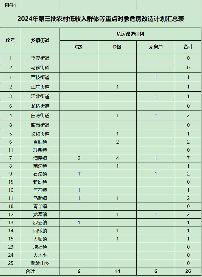 经区农业农村委员会、区民政局对各乡镇(街道)申报计划农户的低收入群体身份再次核实,第三方检测机构对其房屋安全等级逐户核查及各乡镇(街道)公示确认后,共有26户(C级6户、D级 13户、无房户 7户)符合农村低收入群体等重点对象危房改造条件,作为此次计划下达。补助标准按 C级每户 0.75万元,D级和无房户每户 3.5万元执行,若出新政策,补助标准按照新的政策执行。各乡镇街道要采取有力措施加快推进,确保2024年9月底前全部开工,2024年 12月底前全部竣工。
