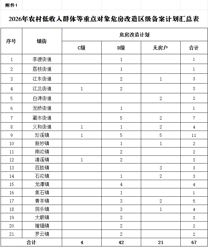 经对各镇街上报的动态监测农村低收入群体等重点对象危房信息进行汇总审核,现将符合危房改造条件的对象纳入2026年农村低收入群体等重点对象危房改造区级备案计划(详见附件)。具体事项通知如下: