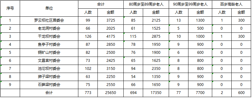 涪陵区罗云镇2025年8月高龄津贴发放金额汇总表