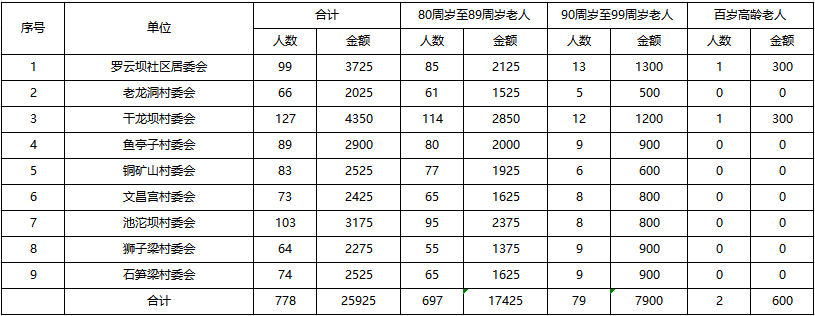 涪陵区罗云镇2025年9月高龄津贴发放金额汇总表