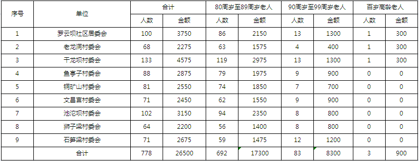 涪陵区罗云镇2026年2月高龄津贴发放金额汇总表