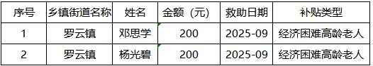 2025年9月涪陵区罗云镇经济困难高龄失能老年人养老服务补贴名单