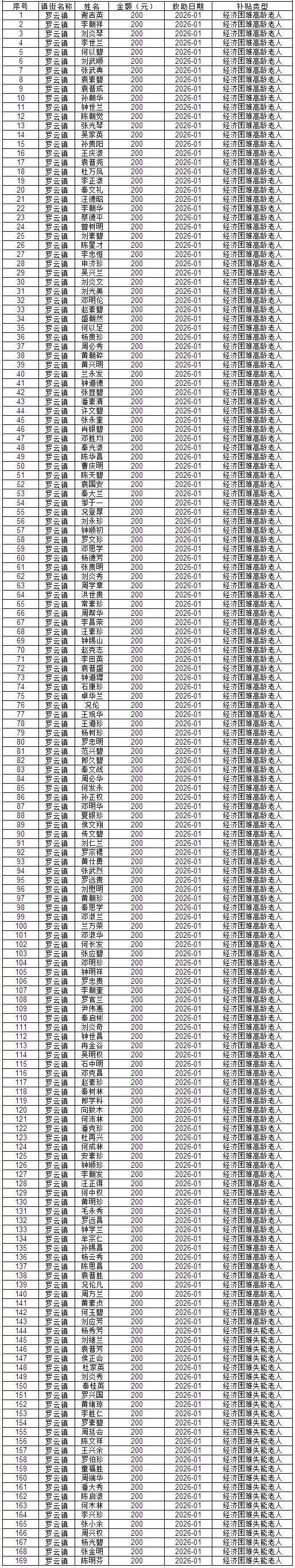 2026年1月涪陵区罗云镇经济困难高龄失能老年人养老服务补贴名单