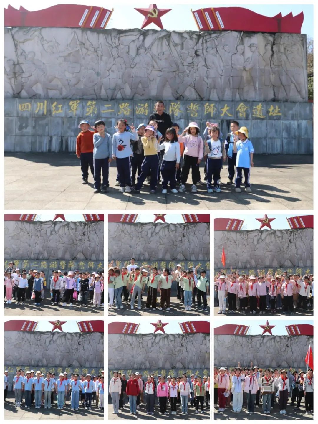 抵达铜矿山顶的四川红军第二路遗址,学生们和老师们依次在遗址前合影,孩子们的欢笑声与山风交织,回荡在苍翠的铜矿山间。