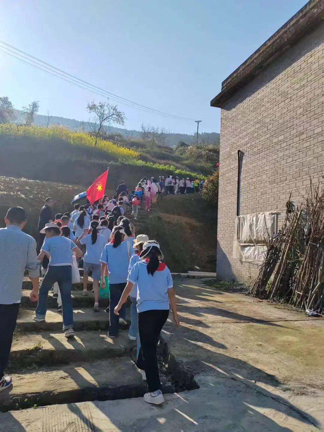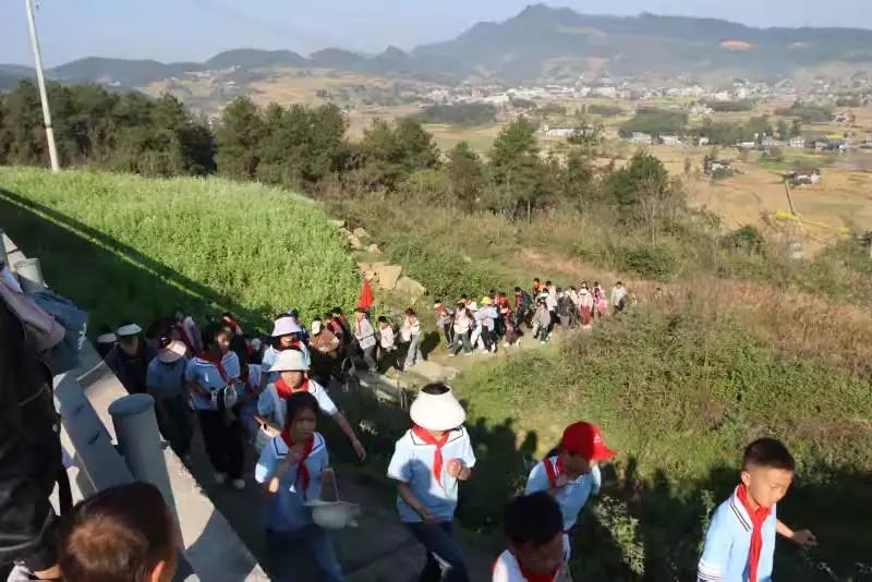 铜矿山脚下的红军路全长1.6公里,1000多级石阶蜿蜒而上,垂直落差达700米。学生们以小队为单位,踏着青苔斑驳的石阶向上攀登。汗水浸透衣襟,喘息声此起彼伏,但无人掉队。 汗透的校服、磨红的掌心,让课本中"乌蒙磅礴走泥丸"的诗句化作切身体悟。