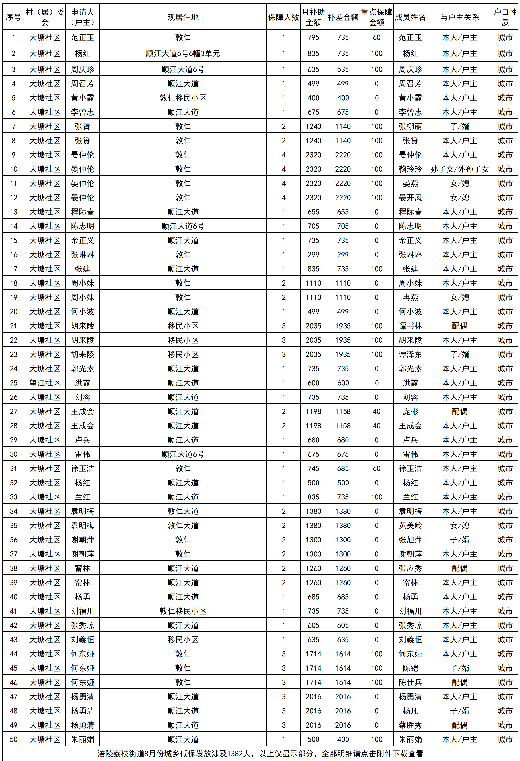 涪陵区荔枝街道2025年8月城乡低保个人发放明细表
