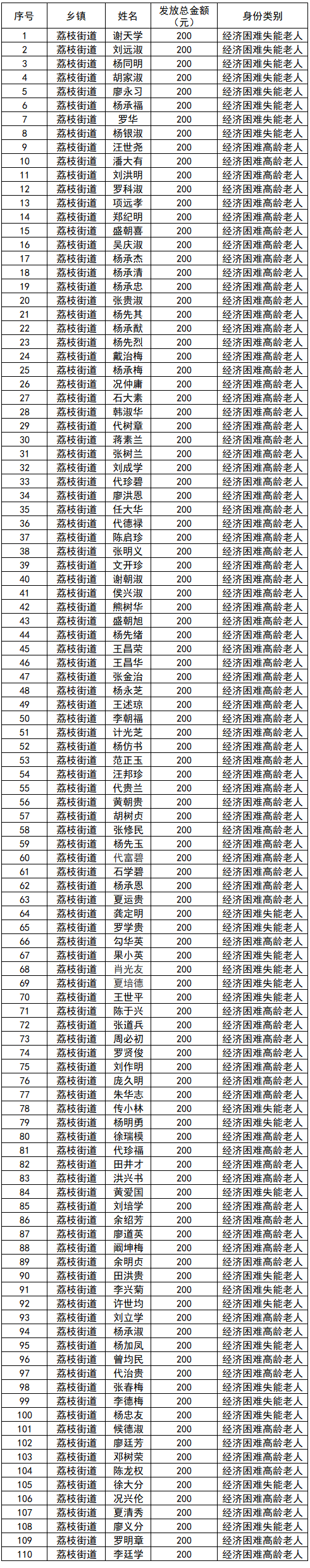 涪陵区荔枝街道2026年1月经济困难高龄失能老年人养老服务补贴名单
