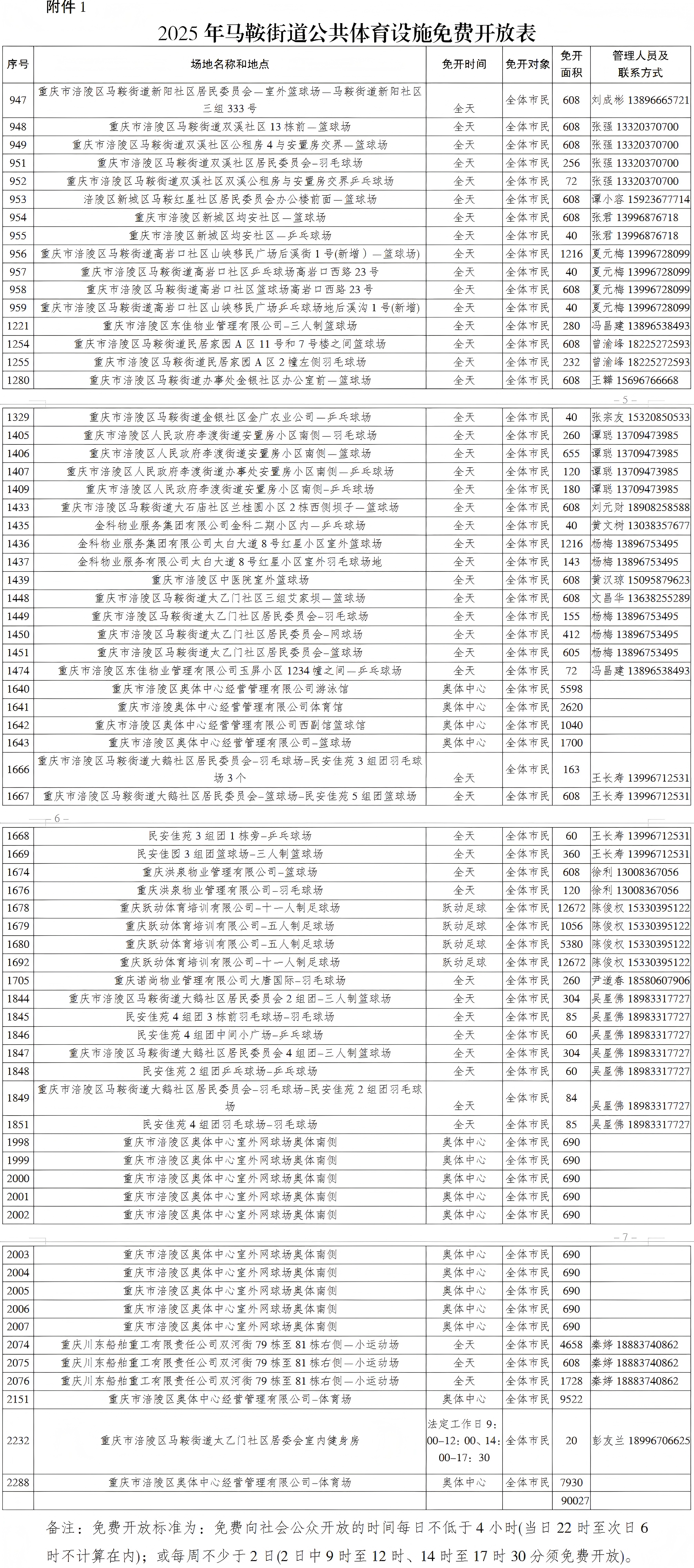 附件:1.2025年马鞍街道公共体育设施免费开放表