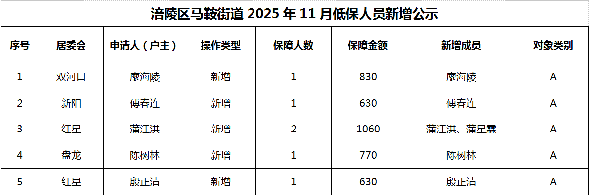 涪陵区马鞍街道2025年11月低保新增人员及个人发放明细