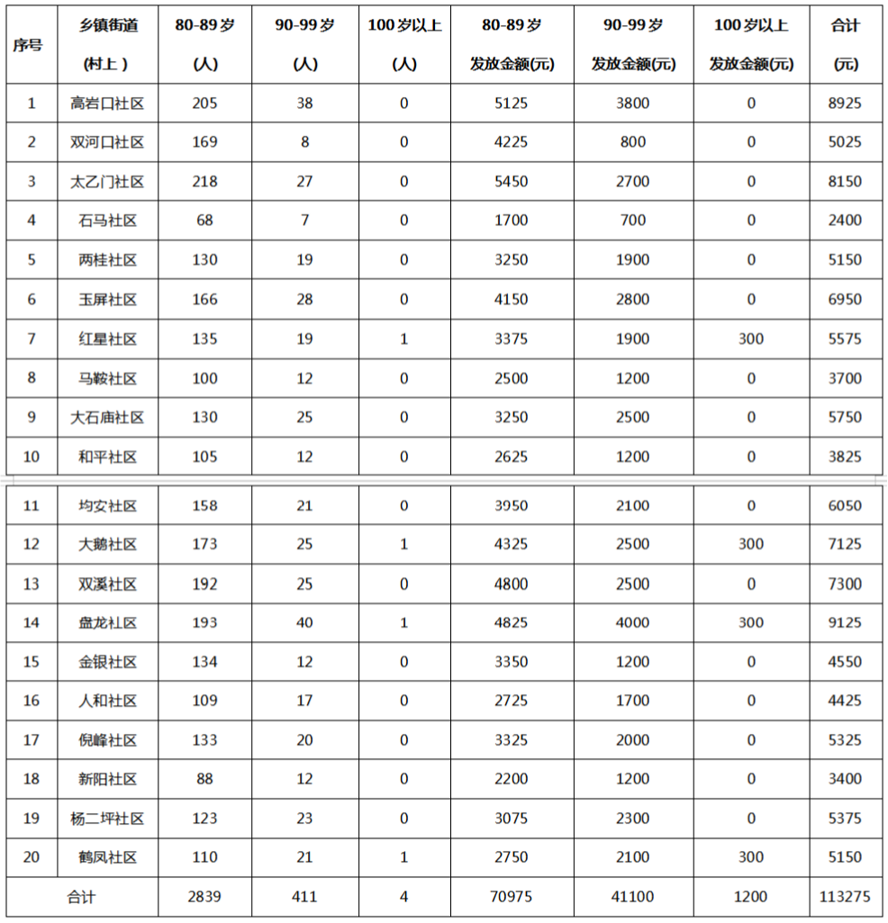 涪陵区马鞍街道2026年1月高龄津贴发放金额汇总表