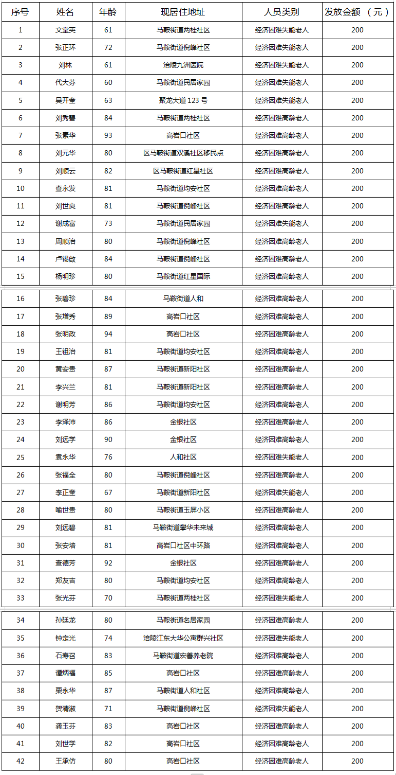 2025年10月涪陵区马鞍街道经济困难高龄失能老年人养老服务补贴名单