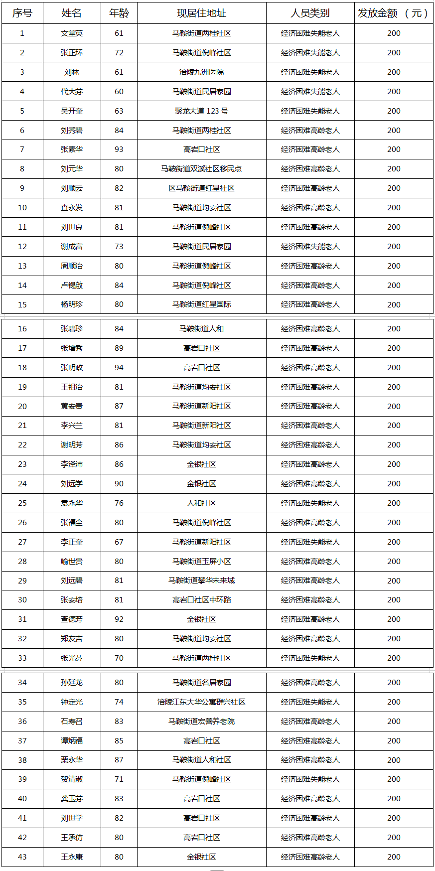 2025年12月涪陵区马鞍街道经济困难高龄失能老年人养老服务补贴名单