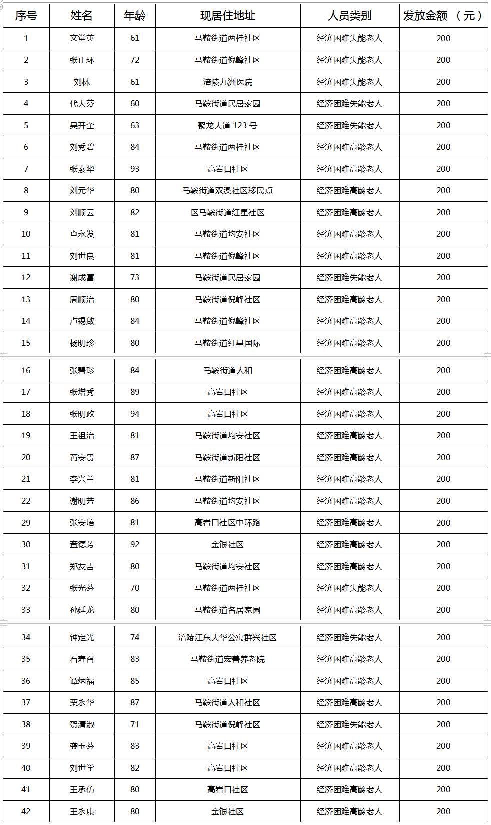 2026年2月涪陵区马鞍街道经济困难高龄失能老年人养老服务补贴名单