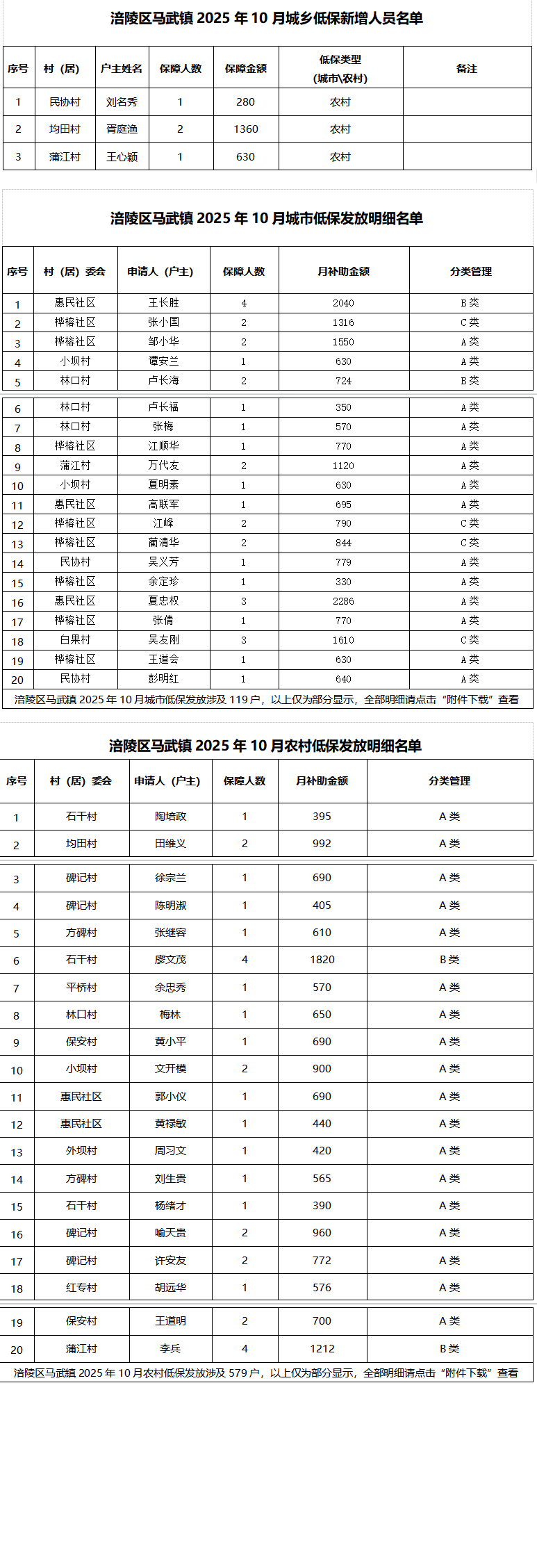 涪陵区马武镇2025年10月城乡低保新增人员及个人发放明细表