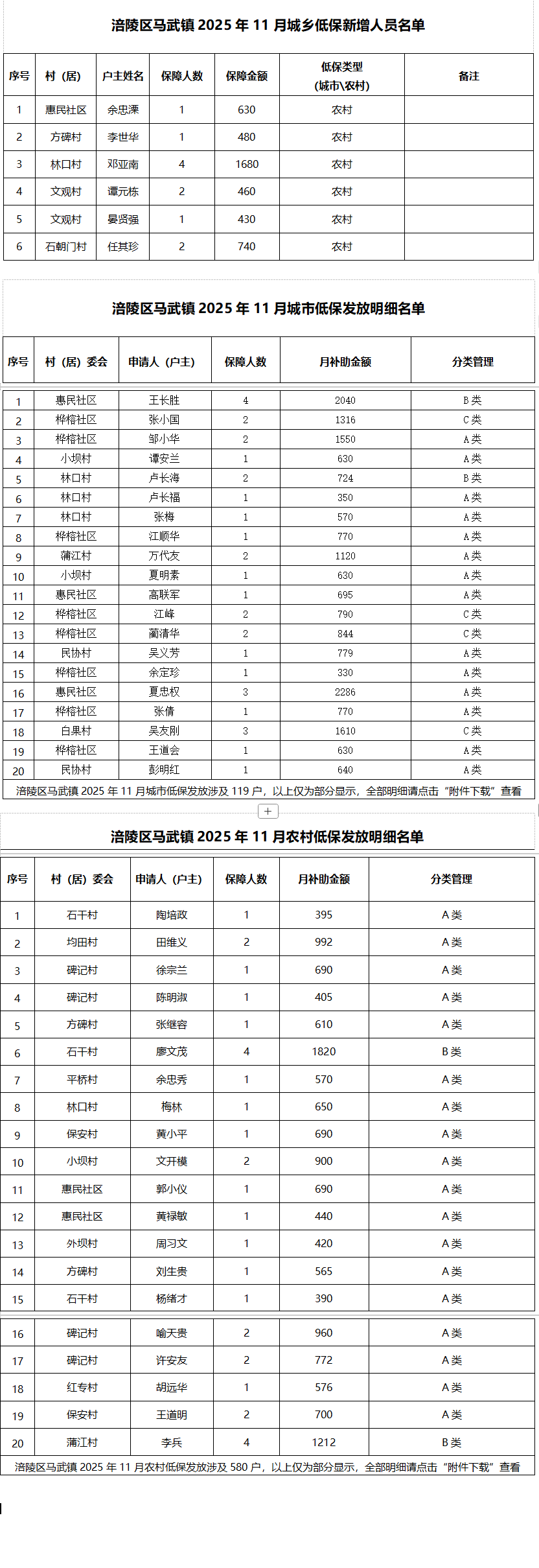 涪陵区马武镇2025年11月城乡低保新增人员及个人发放明细表