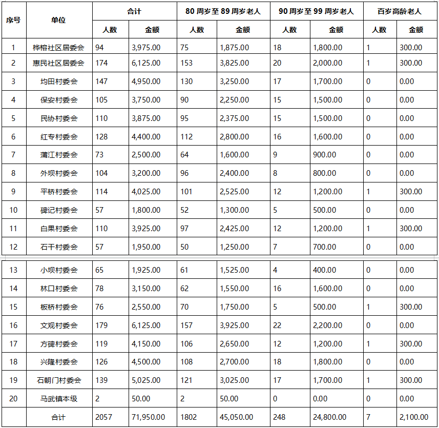 涪陵区马武镇高龄津贴发放金额汇总表(2025年12月)
