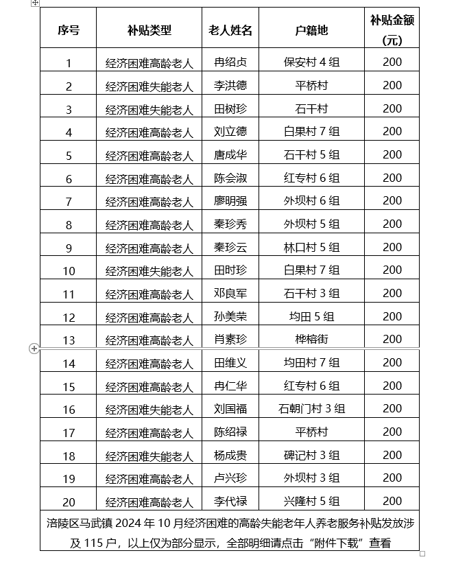 涪陵区马武镇2024年10月经济困难的高龄失能老年人养老服务补贴发放花名册