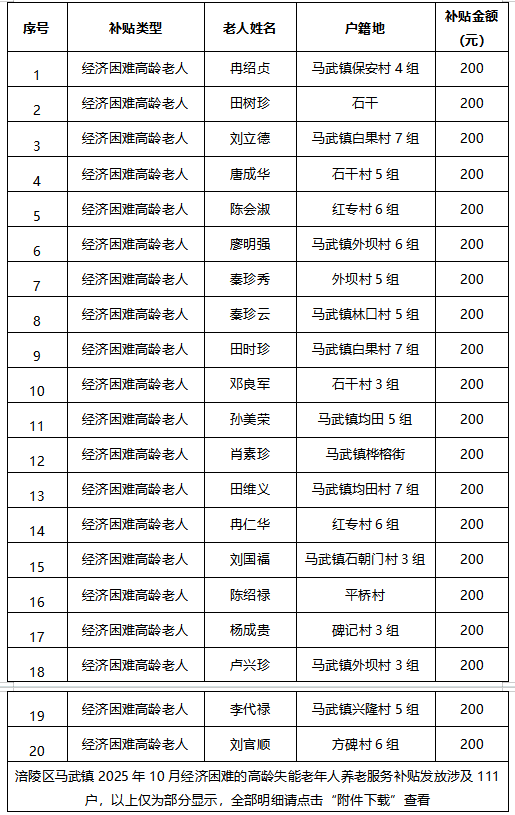 涪陵区马武镇2025年10月经济困难的高龄失能老年人养老服务补贴发放花名册