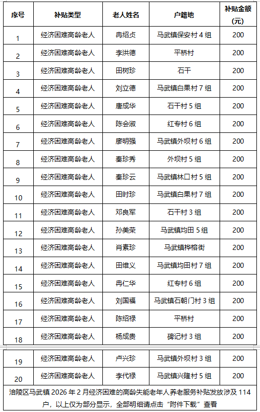 涪陵区马武镇2026年2月经济困难的高龄失能老年人养老服务补贴发放花名册
