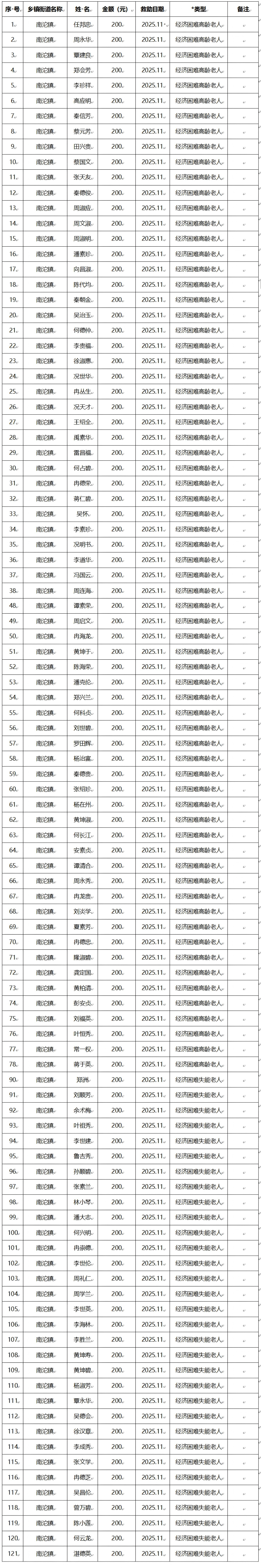 2025年11月涪陵区南沱镇经济困难高龄失能老年人养老服务补贴实发名单