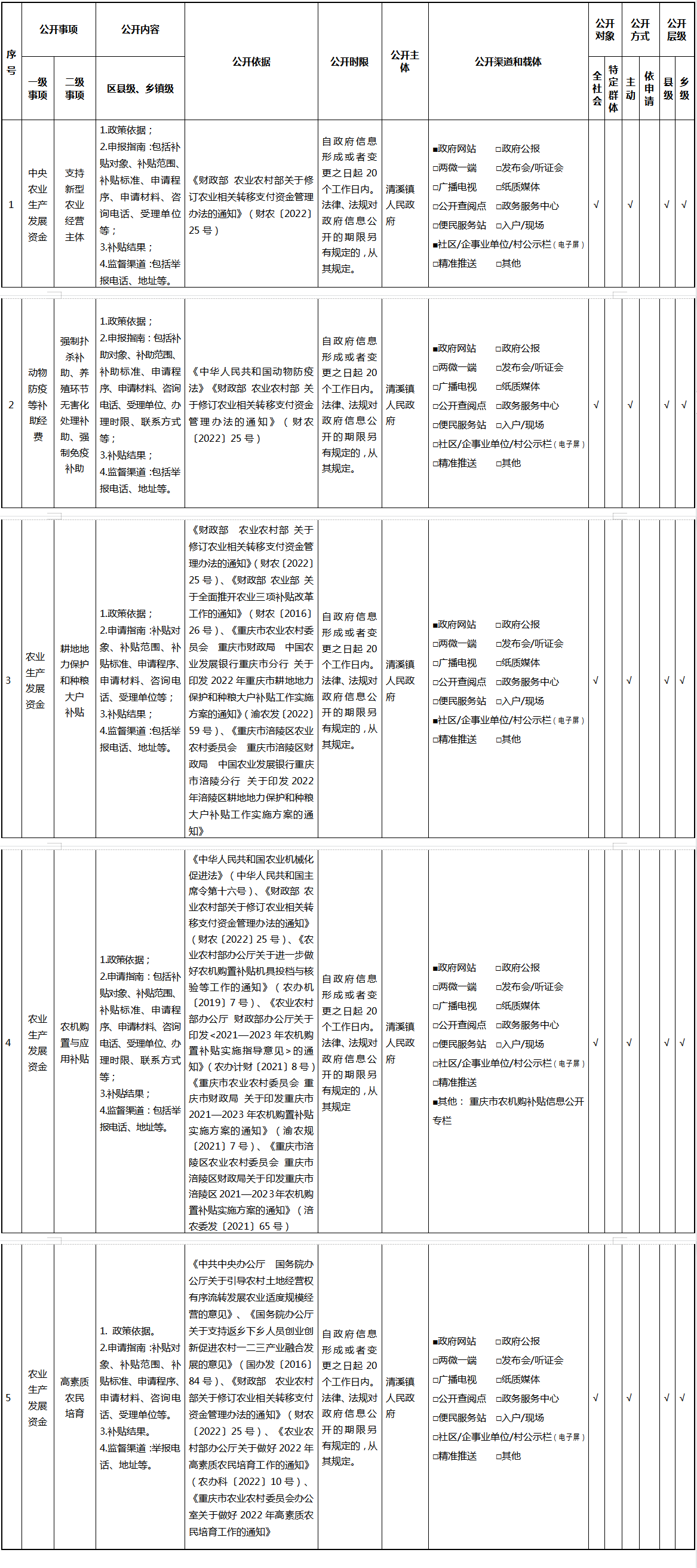 重庆市涪陵区清溪镇人民政府涉农补贴领域基层政务公开标准目录(2026年版)