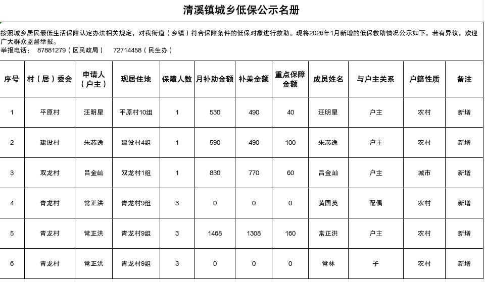 涪陵区清溪镇2026年1月城乡低保人员新增公示