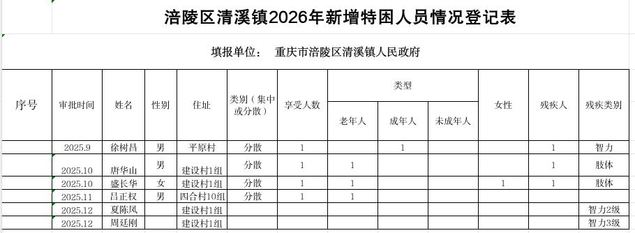 涪陵区清溪镇2026年1月特困人员新增公示