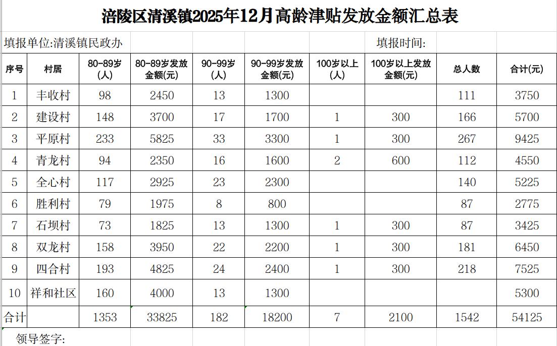 涪陵区清溪镇2025年12月高龄津贴发放金额汇总表