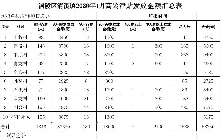 涪陵区清溪镇2026年1月高龄津贴发放金额汇总表
